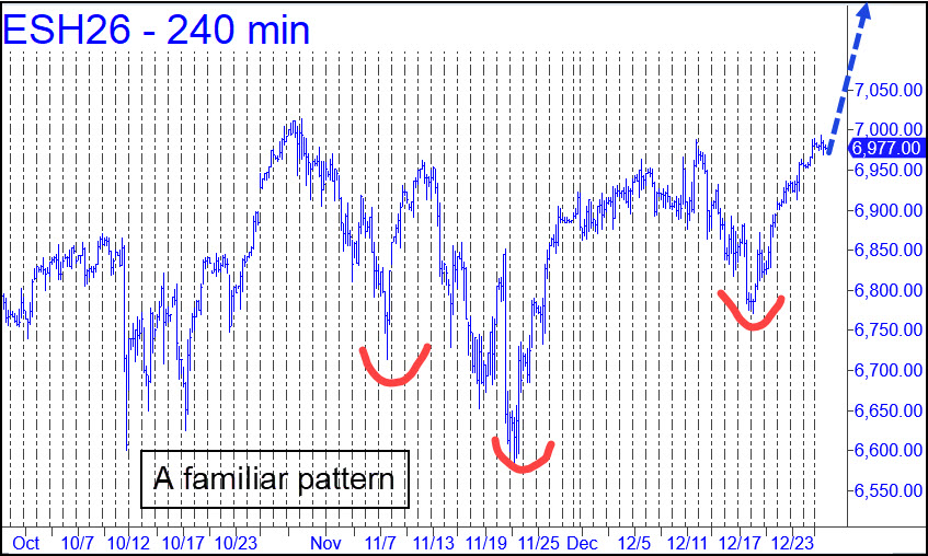 The reverse head-and-shoulders pattern shown yields a target up near 7,250, implying that 2026 will begin with a bullish bang. I don’t often refer to H&S patterns because they can be found anywhere one looks for them. However, there is no denying that they describe a telling picture of supply and demand, and that bulls have the upper hand in the picture shown. From a Hidden Pivot standpoint, a mere 7026.50 is as high as I can comfortably project. That implies the head-and-shoulders effect will be stillborn, a possibility to which we should remain open-minded but without bias. If buyers blow past that number, it would shorten the odds of a follow-through to 7250 or so.