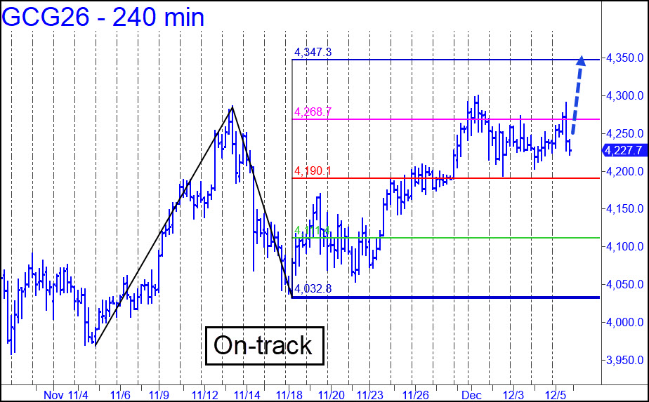 Last week’s tedious scuddle left the futures on-track for a run-up to at least 4347.30 over the near-term. This Hidden Pivot resistance is just a weigh station en route to the 4529.80 target of a much larger pattern given here earlier. The D target of that pattern is 5126.10, the first I’ve identified above $5k. I expect potentially tradable resistance at 4347.30, but if buyers punch through it easily, that would shorten the odds of an eventual move to the higher targets given above.