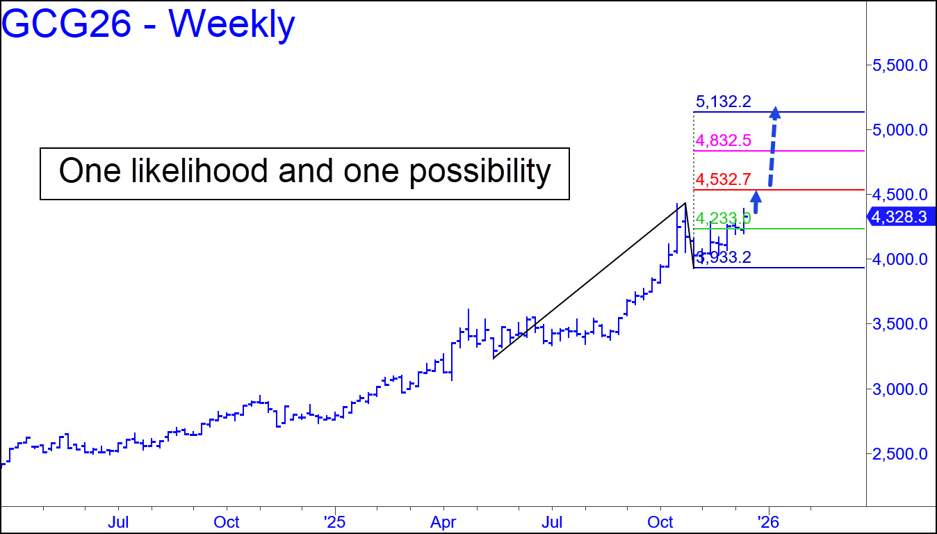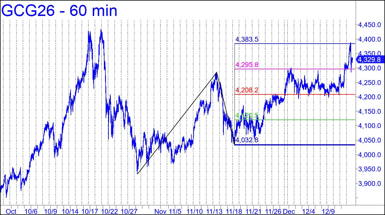I seldom use a ‘marquee’ low to project a target, but in this case, A= 3933.20 caught Friday’s spike high almost exactly. The high overshot the target by $4.30, which is not enough to guarantee that higher prices are coming. They will, though, so let’s keep this chart in mind as the futures make their way higher in the days and weeks ahead. It implies minimum upside over the near term to the red line (p=4532.70, the pattern’s Hidden Pivot midpoint), and to as high as D=5132.20, a target that will become an odds-on bet if bulls bulldoze past p. ______ UPDATE (Dec 17, 5:09 p.m.): Check the chat room for my latest updates, targets and tradable ideas.