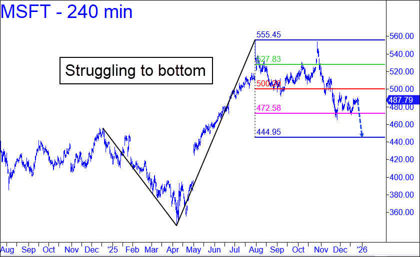 Although the trend has been bearish since the stock at peaked at 555.45 in July, bears have struggled lately to achieve the implied correction target at 444.95. Most immediately, I expect the stock to run up to the 496.09 target of a minor pattern. If it takes out the pattern’s ‘C’ low at 482.09 (12/19) first, however, I’d consider the possibility that stocks are in a bear market more seriously. Because of its solid revenue stream and its pre-eminence in the lunatic sector (aka the Magnificent Seven), Microsoft remains my #1 bellwether for the 16-year-old bull market.