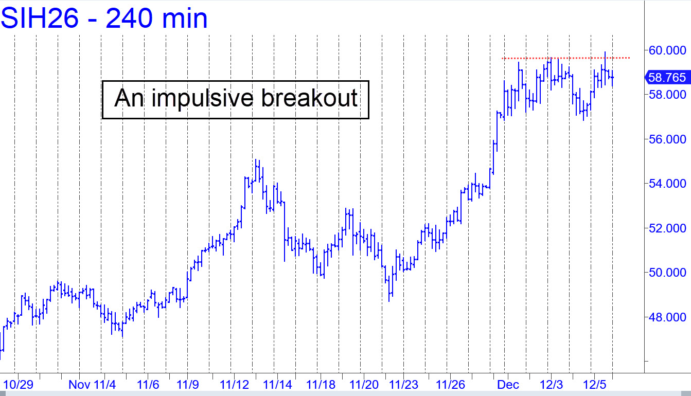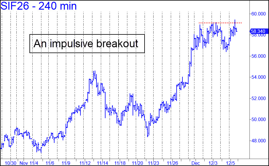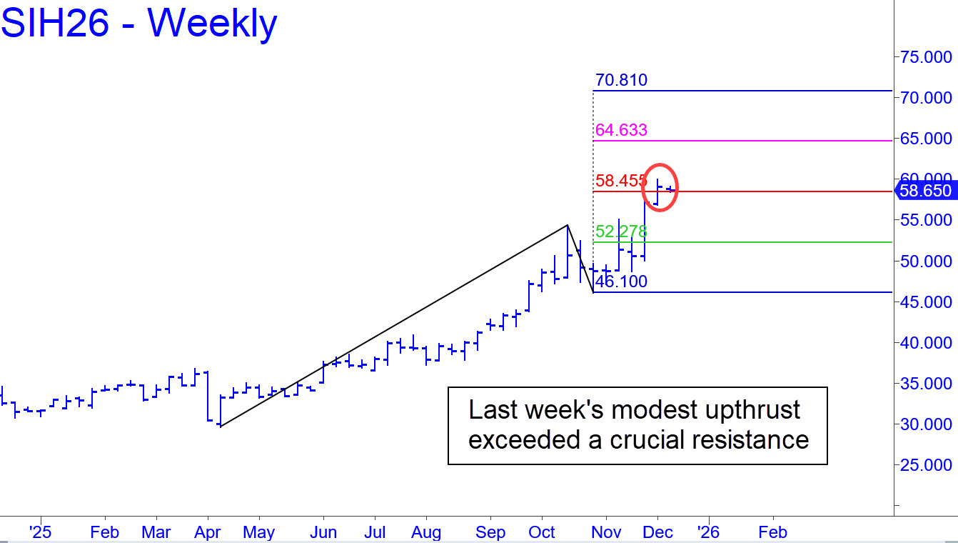 Although Silver broke out around mid-morning on Friday, it spent the remainder of the session idling in a shallow pullback. This behavior reflects the preference of strong, confident buyers who could use a little rest. The quiet end to the week was deceptive, since it featured a decisive push through a 58.45 midpoint Hidden Pivot associated with a ‘D’ target at 70.81. (Please note that this number was incorrectly given here last week for the January contract as 63.39). A pullback to the green line (x=52.27), however unlikely, would be a screaming ‘mechanical’ buy. Here’s a chart showing the futures’ crucial progress last week.