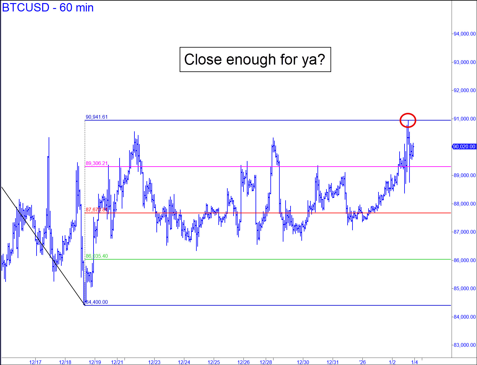 I predicted earlier in the week that this hoax would probably go no higher than 90,941 over the near term. In fact, an easily tradeable top did occur at 90,935 on Friday, meaning the forecast missed by just 0.006%, or six-thousandths of a percentage point. That’s pretty routine for spontaneous trade recommendations posted in the chat room, as any subscriber could attest, and it could have made an alert scalper more than $2,000 if he or she got long when the target was posted, then another $2180 if the position was reversed ahead of the subsequent swoon. Sadly, the reaction in the chat room to this dead-center bullseye was muted, to put it mildly, leaving me with little incentive to continue covering Bitcoin. Accordingly, unless I hear from at least a dozen subscribers who want BTC to remain on the list, I will substitute another symbol, presumably one that has greater significance for the economy. If you are pimply-faced robinhoodie who has followed my Bitcoin touts surreptitiously, your vote, too, will count, but you’ll need to subscribe to Rick’s Picks for money to record your preference in the chat room.