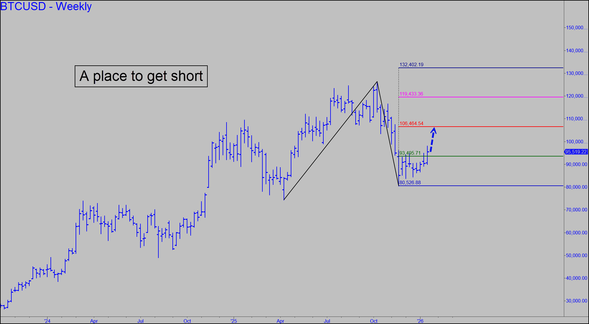 Let’s use the imagined head-and-shoulders formation I drew here last week to get short at 106,464, the midpoint Hidden Pivot resistance of the pattern shown. The provenance of the 108,378 stop-loss I am recommending is novel, since it is derived from an unrelated ‘mechanical’ set-up that carries more risk. This is a blend of the two trades, with a price objective of 72,808. That implies this long-term trade will be risking $1914 initially to make as much as $27,144. Please note that the odds of getting stopped out are significantly higher than if we employed an entry strategy with a wider stop-loss. _______ UPDATE (Jan 20): Bitcoin’s plunge on Sunday put my wishful short far out of reach. It could now fall to 87,722 — gratuitously — over the next 3-5 days, and a rally to 95,403 would trigger a ‘mechanical short, stop 97,964. _______ UPDATE (Jan 21, 1:18 p.m.): For lack of genuine interest, Bitcoin has flunked the reinstatement test. The $2800(!) bounce off yesterday’s low came from within 22 points — a fiftieth of a percentage point! — of the 87, 722 target I’d advertised in the last update (see above). There was no mention of this in the room, not even from the dozen-or-so subscribers who professed to want BTC to remain on the list. Accordingly, starting on Sunday, I will substitute Copper on the touts list. I am willing to provide private Bitcoin forecasts to anyone who wants them, but the charge will be $1500/month, and I will need at least four signups to initiate coverage. The service will come with a money-back guarantee, details on request. Serious inquiries only at the email address given in the chat room.
