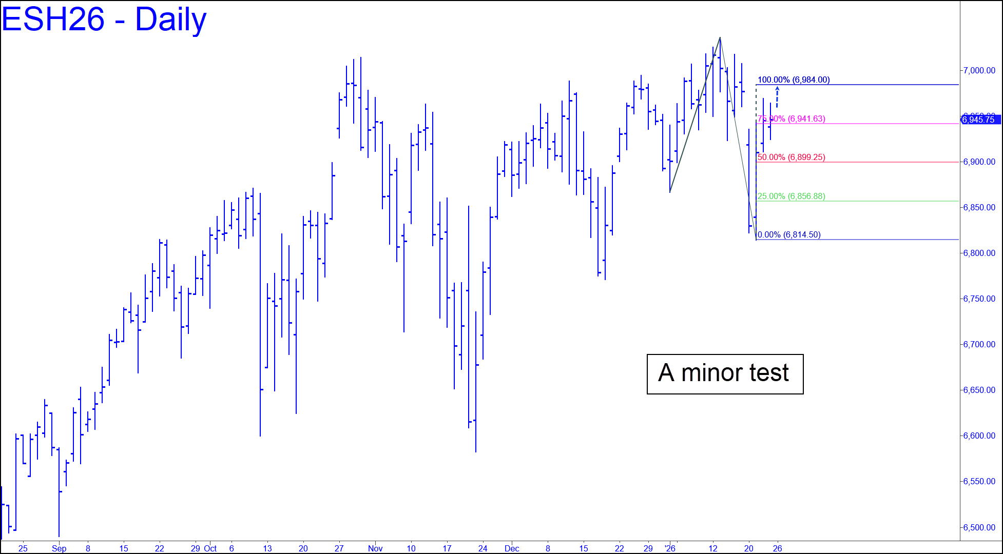 The mindless herd breathed a collective sigh of relief over the tariff tizzy’s latest cliffhanger, celebrating its resolution with a short squeeze up their own wazoos that played out mostly on a single day, Wednesday. The spree left the futures just shy of a 6984.00 target that is nothing special, although its decisive breach would suggest a possible breakout above the range that has asphyxiated the S&Ps since Halloween. More likely is a drop back into the valley, whose floor lies as much as 1400 points below. The 6984.00 target is shortable, but you could also attempt a ride to it, since it is all but certain to be reached. _______ UPDATE (Jan 27, 9:28 p.m.): ES is breaking out, as painful as it is for me to believe. See my comments in the chat room.