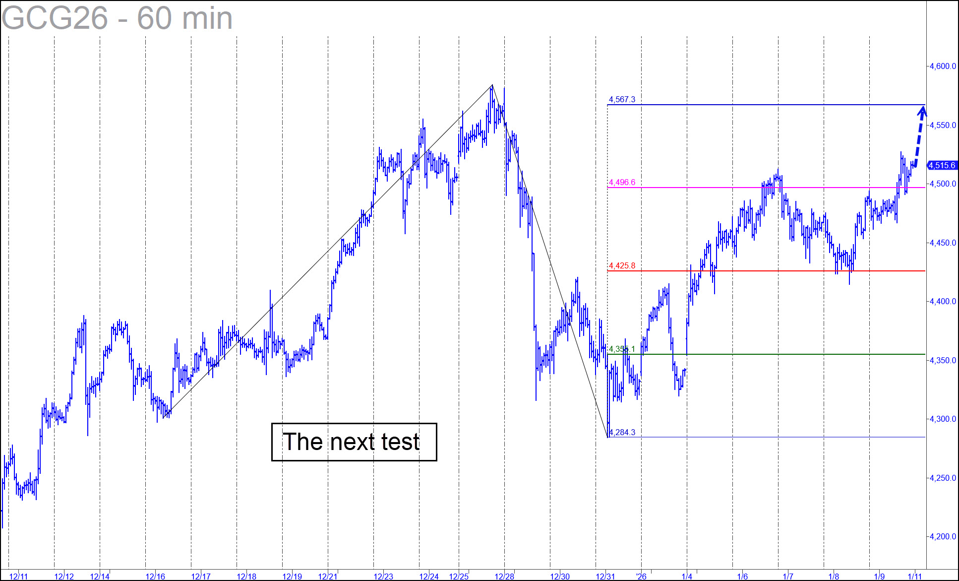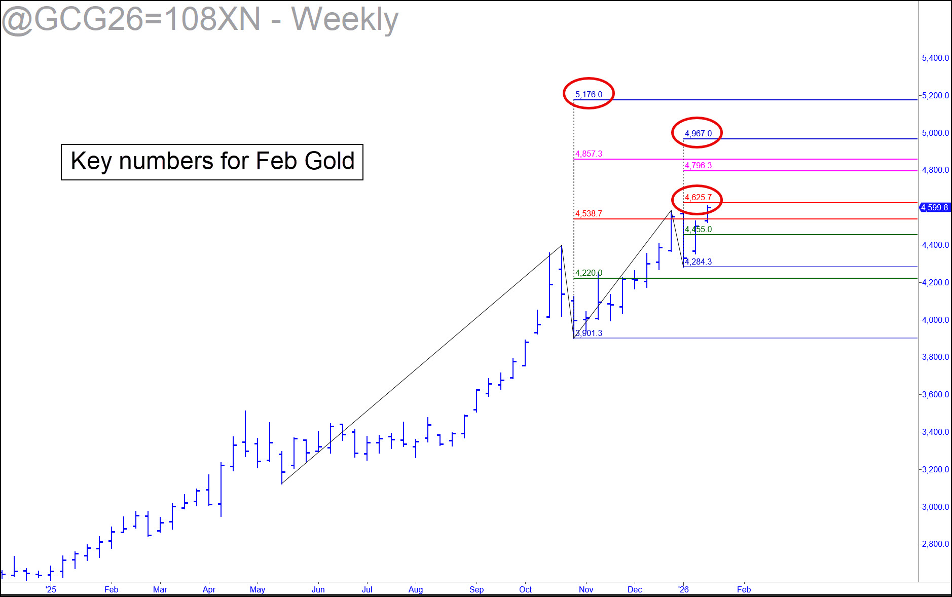 Bulls should enjoy smooth sailing up to the 4567.20 target shown. Allow for an alternative target four points higher, since I’ve used an irregular point ‘A’ low to construct a slightly reversed pattern. There should be little resistance at either Hidden Pivot, since the old high at 4584.00 beckons a test. The first obstacle above the peak is 4607.00, a ‘D’ Hidden Pivot derived from A=4319.70 (January 2) on the same chart. Since that number is unknown to other traders, it should provide an accurate ‘read’ on trend strength. You can short it with a ‘camo’ trigger if you are familiar with the tactic. ______ UPDATE (Sunday, 8:52 p.m.): Gold has opened more than $100 higher this evening, exceeding my 4607.00 target (see above), but not decisively. An update is warranted, however. Here’s a link to a chart that should be able to confirm or refute Avi Gilburt’s dramatic prediction of an imminent, major top in bullion. (See last night’s chat room post from 1:59 a.m.) The new chart shows two bullish patterns in play. The 4538 midpoint Hidden Pivot of the larger one has already been exceeded, but not with enough force to ‘guarantee’ that D=5176.00 will be reached. The smaller pattern has a midpoint resistance at 4625.75 that is about to be touched. If the futures blow past it, that would greatly shorten the odds of a further push to D=4967.00. In any event, p=4625.75 is where our focus should be right now.