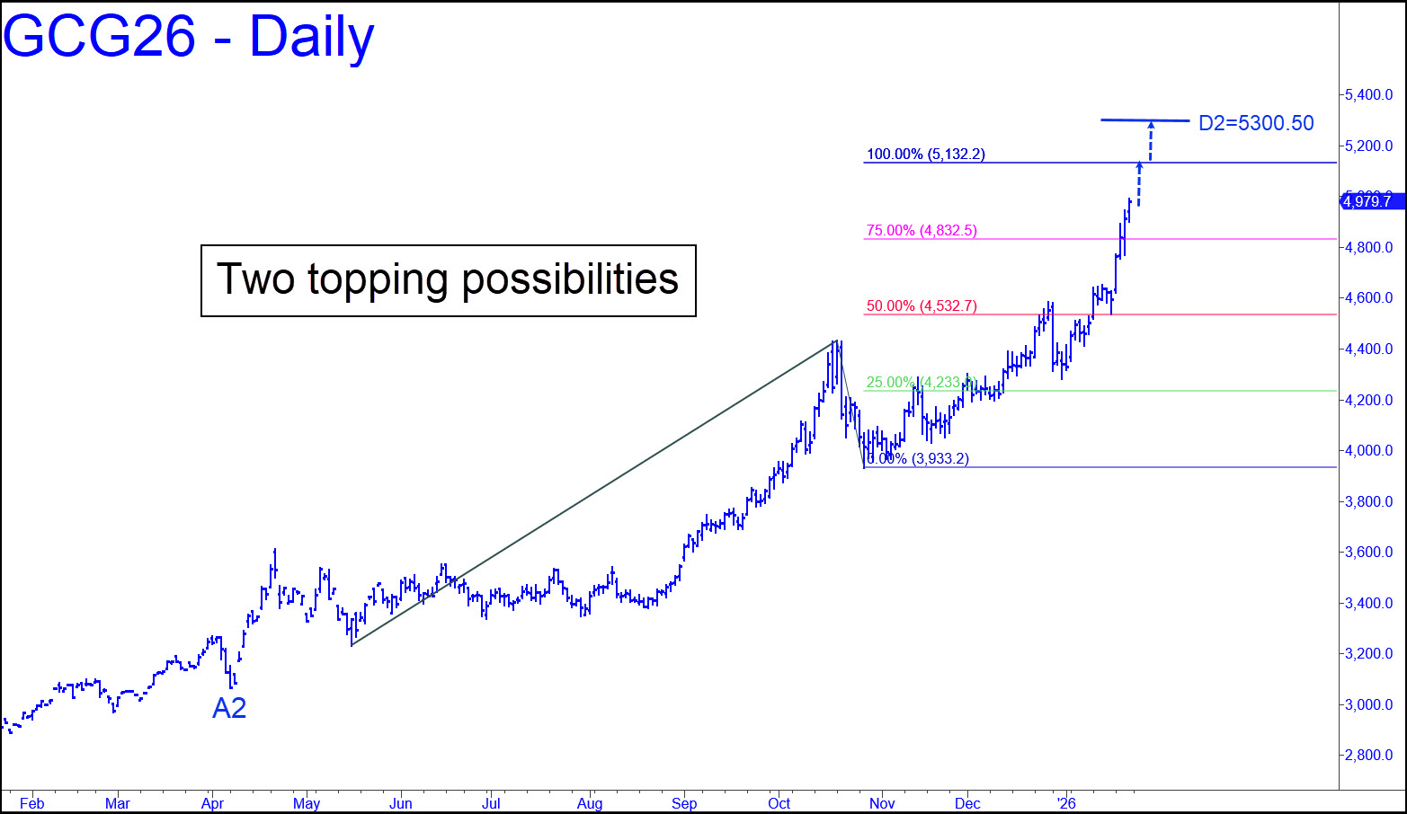 The daily chart yields two logical possibilities for a top, or at least a pause, at either of two prices: 5132.20, which I’ve been drum-rolling for a while; or 5300.50. The latter represents an extension of the A-B leg that features a highly unorthodox low labeled A2. Both targets are sufficiently compelling to suggest that bulls will not easily get past them. The patterns, while not in-your-face obvious, are easy enough to identify that we should not expect them to show precise stopping power. Let’s therefore be prepared for a stall in a place no one is watching: 5129.60, midway between p2 and D of the larger bottom. Notice that it coincides with the lower target at 5132.20, implying there will be double stopping-power there. _______ UPDATE (Jan 27, 9:35 p.m.): A stall? What on earth could I have been thinking?? This evening’s lunatic leap will achieve a minimum 5281.90, exactly 66 points above; and thence, assuredly, a minimum 5300.50.
