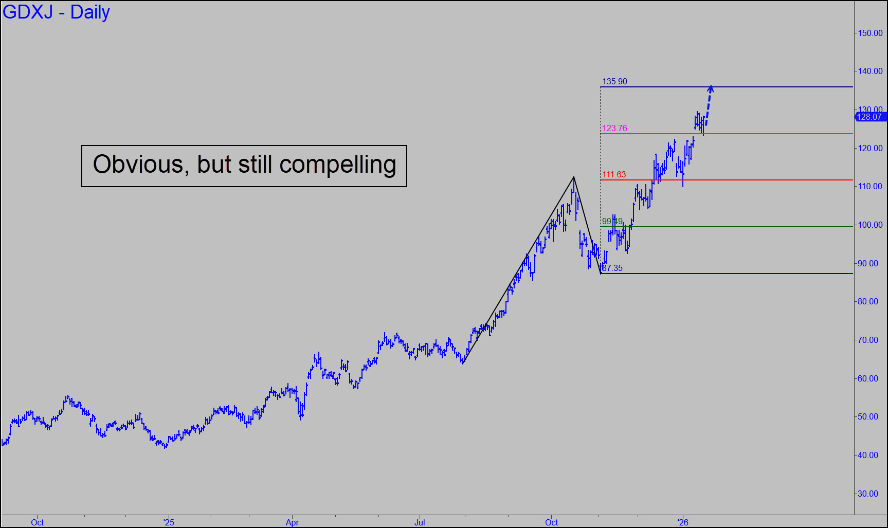 There is nothing to suggest this vehicle will not reach the target at 135.90, a once-unimaginable milestone that was first signaled in mid-November when GDXJ crossed up through the green line. The subsequent, confident move through the red line, a midpoint Hidden Pivot resistance at 111.63, significantly shortened the odds the target would be realized. This now appears all but certain, and although it would be implicitly bullish for gold, we shouldn’t be too concerned if the respective moves appear to be somewhat out of synch. The ABCD pattern is sufficiently clear to imply that the correction following the final run-up to the target could be long and painful. _______ UPDATE (Jan 20, 11:10 a.m.): It is headed to 139,55 at least, or to 144.86 if any higher. Currently 134.68, just off the high.