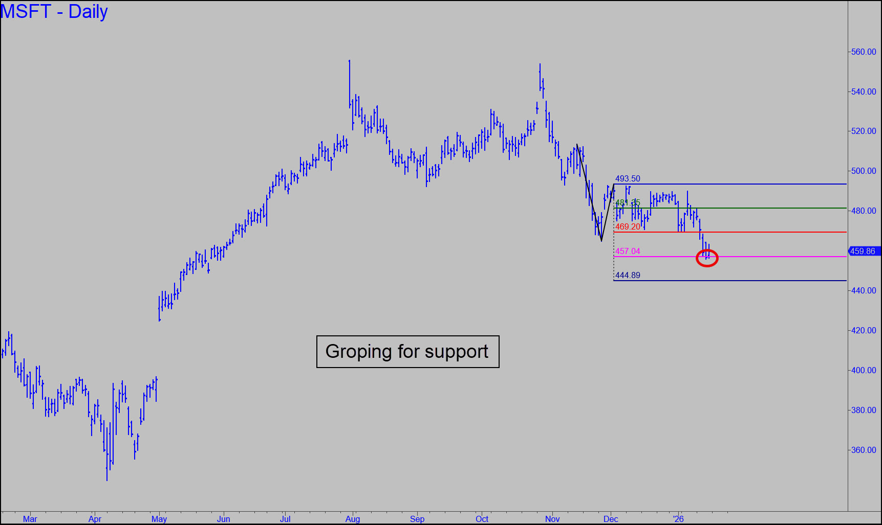 The stock spent most of the week lollygagging near the 457.04 ‘secondary Hidden Pivot’ of the bearish pattern shown. Its eventual target is 444.89, a $15 fall from here. However, the breach of p was such a laborious affair that I cannot guarantee that it will be achieved. But if p2 is decisively exceeded to the downside, or if the stock closes for two consecutive days beneath it, odds of further fall to 444.89 would shorten significantly. For now, 444.89 should be viewed as a worst-case low for the near term. It is also a back-up-the-truck number for bottom-fishing, since even with the somewhat obvious pattern, D=444.89 cannot possibly give way without a struggle. ________ UPDATE (Jan 21, 5:57 p.m.): After the stock MSFT has put in a tradable bottom at or very near 431.89, the rally along a big-picture C-D leg would have the potential to reach 593.79. Seems farfetched, I know, but the stock will face a test we can rely on near 469.29, a major midpoint Hidden Pivot that coincides with the 2024 top. Neither of those Hidden Pivots exists yet, and their exact, respective locations will depend on where the actual low occurs. Please note that the time stamp for this post, along with the last price, come from my update in the chat room yesterday.