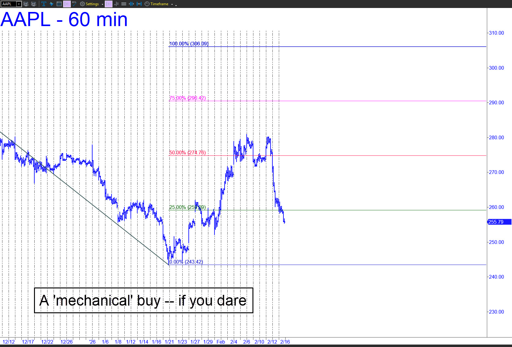I restored AAPL to the core list last week with reservations. The company is a dim also-ran in the AI race, having only recently found a partner in Google, the creator of Gemini. There is also the chance Musk will eventually make iPhones obsolete. He keeps insisting that Starlink has no phone on the drawing board, but he’s probably just trying to screw with Tim Cooke’s head. When the XPhone finally arrives, with superior hardware and no monthly service charge, that will be it for Apple. Concerning the chart, AAPL’s steep slide on Friday triggered a ‘mechanical’ buy at the green line (259.09), stop 243.41. Ordinarily, we’re supposed to feel queasy about excuting such trades, since they will always be going against the trend. In this case, however, I will recommend it only to Pivoteers who know how to fashion a reverse-pattern trigger that risks no more than $3.00 per share theoretical on the entry. It should be good for a one-level ride to p=274.76 if it works. _______ UPDATE (Feb 20): The long position suggested from 259.09 ended the week $5 in-the-black. Continue to hold for a shot at 274.76, or even 306.09. You can raise the stop-loss to 255.81.