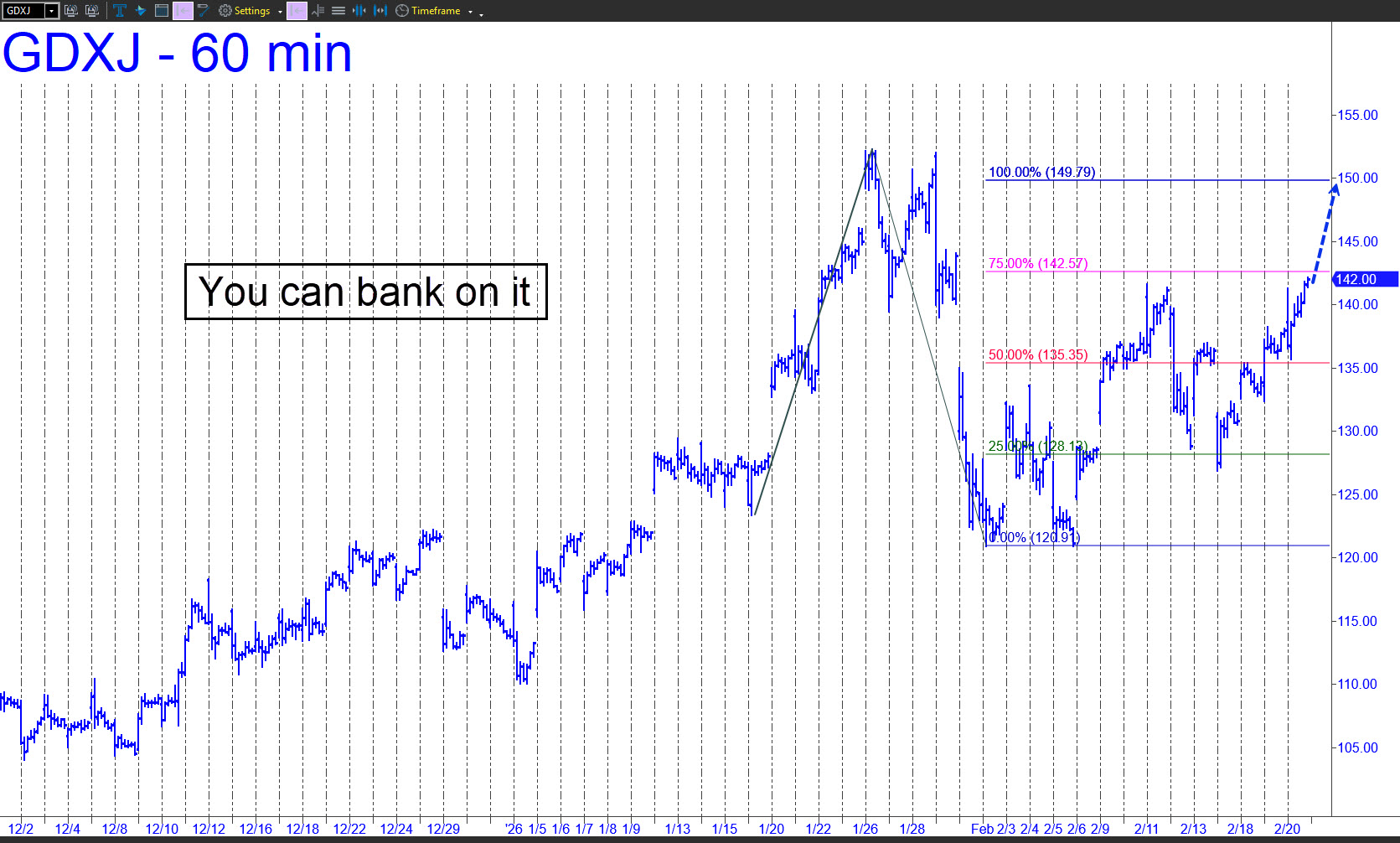 The 149.79 target shown corresponds to the 5476 target featured in the latest gold tout. If it is decisively exceeded, however, especially on first contact, that would imply the bull trend is bound for 163.11. That target, a Hidden Pivot, is derived from a lower point A — i.e., the 110.04 bottom recorded on the first trading day of the year. The sharp pullback over Valentine’s Day did not qualify as a ‘mechanical’ buy because some key elements were missing. However, if GDXJ were to swoon to the green line (x=128.12) now, that would trigger a legitimate buy signal, stop 120.90. Stranger things have happened, so you should be prepared to act if the opportunity arises.