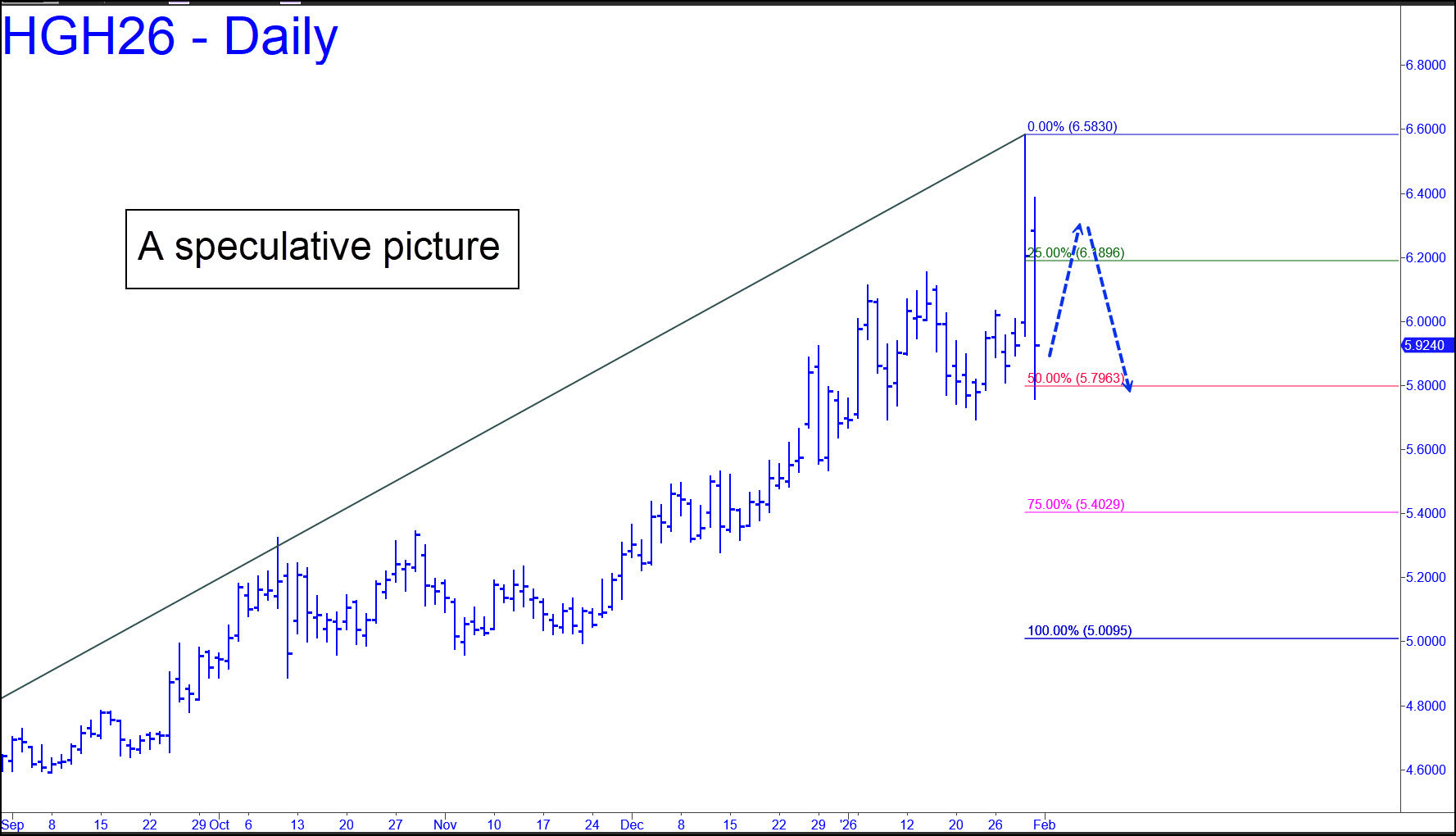 Copper’s correction exceeded the midpoint Hidden Pivot support of a pattern I’ve partially concealed. The overshoot is not sufficient to infer that more slippage to d=5.0095 is a done deal. However, a bounce to the green line (x=6.1896) would set up a moderately attractive ‘mechanical’ short, stop 6.5830, that presumably would be good for a one-level ride back down to p. If a rally from the green line comes from further below p, that would sweeten the odds for shorts initiated at x.