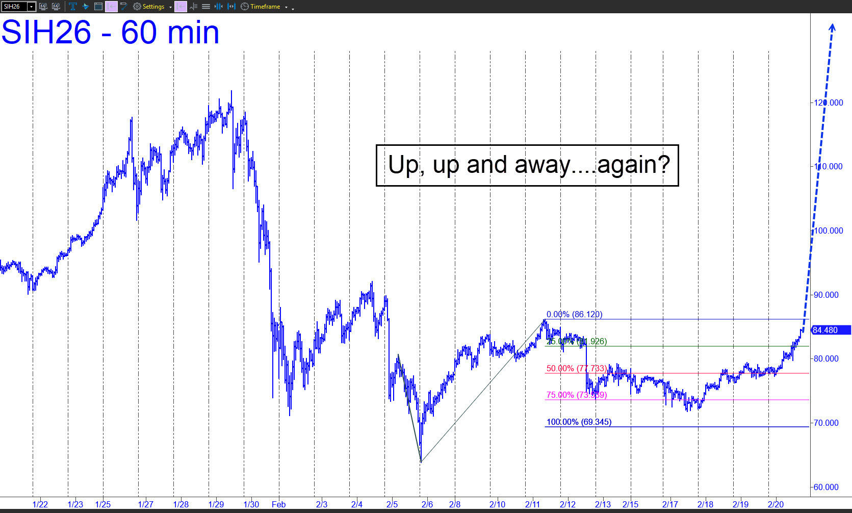I posted a moderately bearish note in Silver in the chat room Friday, but by day’s end the little monster was threatening to trash my logic. The March contract was on ‘mechanical’ short signals in two different time frames, one big, the other small, and things could have gone either way. In fact, things went bonkers, stopping just shy of the 86.13 print needed to negate the lesser ‘sell’ signal. Above it sits 91.285, which some may recall as the location of a stop-loss for the bigger-picture ‘mechanical’ short. We should wait until these numbers are actually exceeded before we open a can of whoop-ass, but bullion looked primed to blow higher when trading resumes on Sunday.