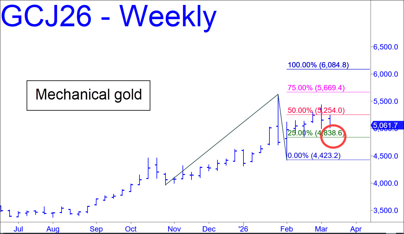 April Gold will trigger a mechanical buy when (not if) it falls to the green line (x=4838.60). The trade is predicated on a 6084.80 target that looks like a 75% shot to be reached. I proffer this information not to get you salivating, but rather to clarify the picture at a time when price action has been lackluster and forecasts are all over the lot. The trade rates an ‘8.1’, which means my confidence is quite high. Since the initial risk would be $41,490 per contract, I am recommending the trade only to subscribers who are quite proficient with ‘camo’ entry triggers, no exceptions.