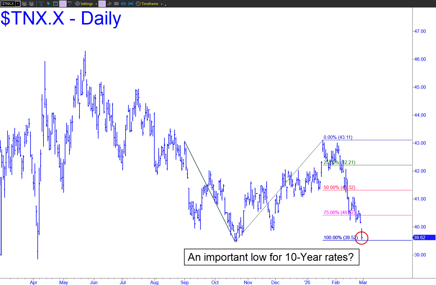 Rates on the 10-Year Note came within a hair on Friday of lows not seen since October. My suggestion is to enjoy it while it lasts, since the intraday bottom closely coincided with a Hidden Pivot target at 3.952%. The actual low was 3.956%, which was near enough to consider the target fulfilled. Alternatively, if the downtrend continues on Monday, breaching not just the target but October’s 3.976% bottom, be ready for more slippage to 3.917%, a voodoo number worth bottom-fishing with as tight a stop-loss as you’re comfortable with. _______ UPDATE (Mar 7): It looks like the prediction of an important low hit a bullseye, since this vehicle has since trampolined as high as 4.19% after bottoming a split hair from the 3.952 target. Here’s the chart. _____ UPDATE (March 11): And now rates have rebounded to as high as 4.23%. Too bad the talking heads on Bloomberg and MSNBC, the Fed board of governors and the Wall Street Journal editorialists weren’t aware of the potentially major turn-up when my forecast caught its exact low, since it’s not often that they have pristine, empirically honest data to work with.
